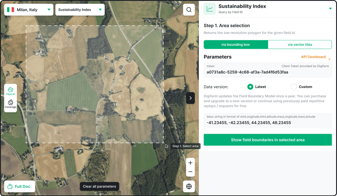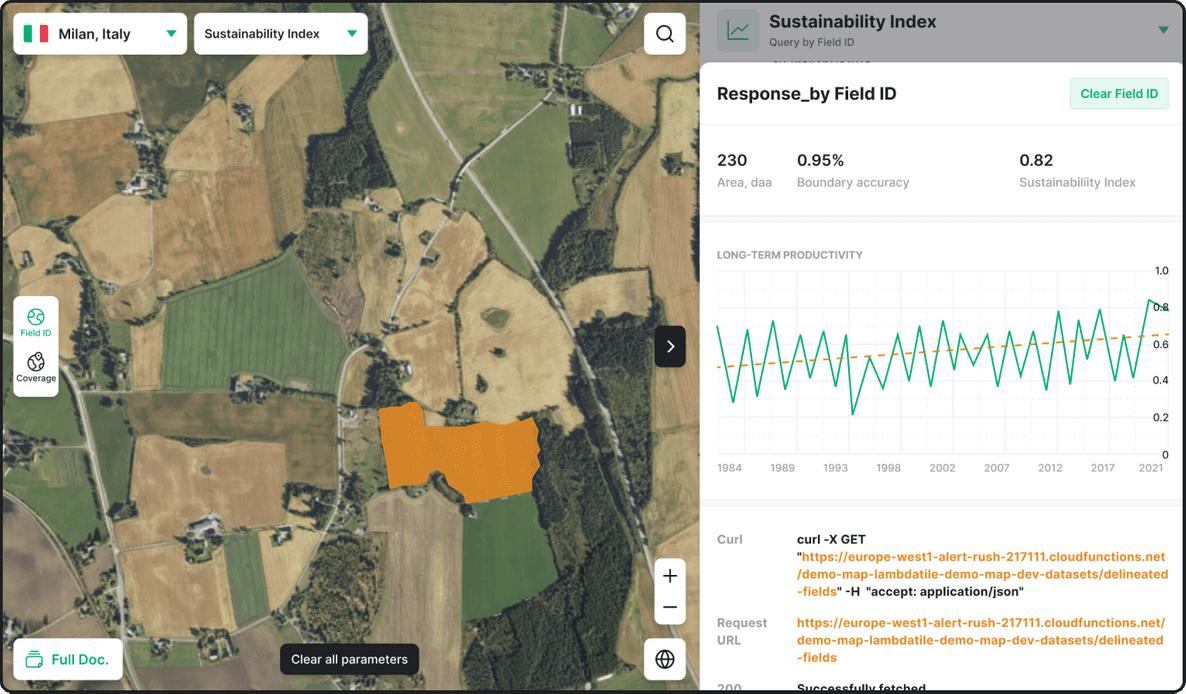 Automatically delineated high resolution field boundaries with pre-processed sustainability index as metadata for a given bbox, point or field id (taken from low res boundaries).